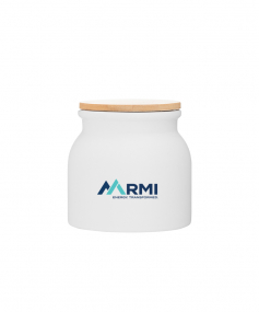 16.9 oz stoneware: matte white out / glossy white in with push-on bamboo lid; Hand wash recommended; Microwave safe with non-metallic imprint; 4 3/16 h x 4 3/16 (w/handle) w ; 500mL.