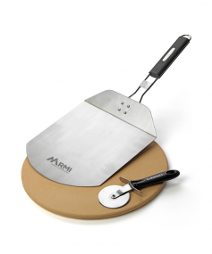 This 3 Piece set provides everything you need to grill a pizza - Pizza Stone, Pizza Peel and Pizza Cutter. Toss the stone on your grill and in about 15 minutes you'll be ready to turn professional looking grilled pizzas out at home. Set includes 13" Pizza Stone; Folding Pizza Peel and Pizza Cutter Folding handle stainless pizza peel stores easily. Complies with CPSIA, Prop 65. 13" W x 2" H x 13" L